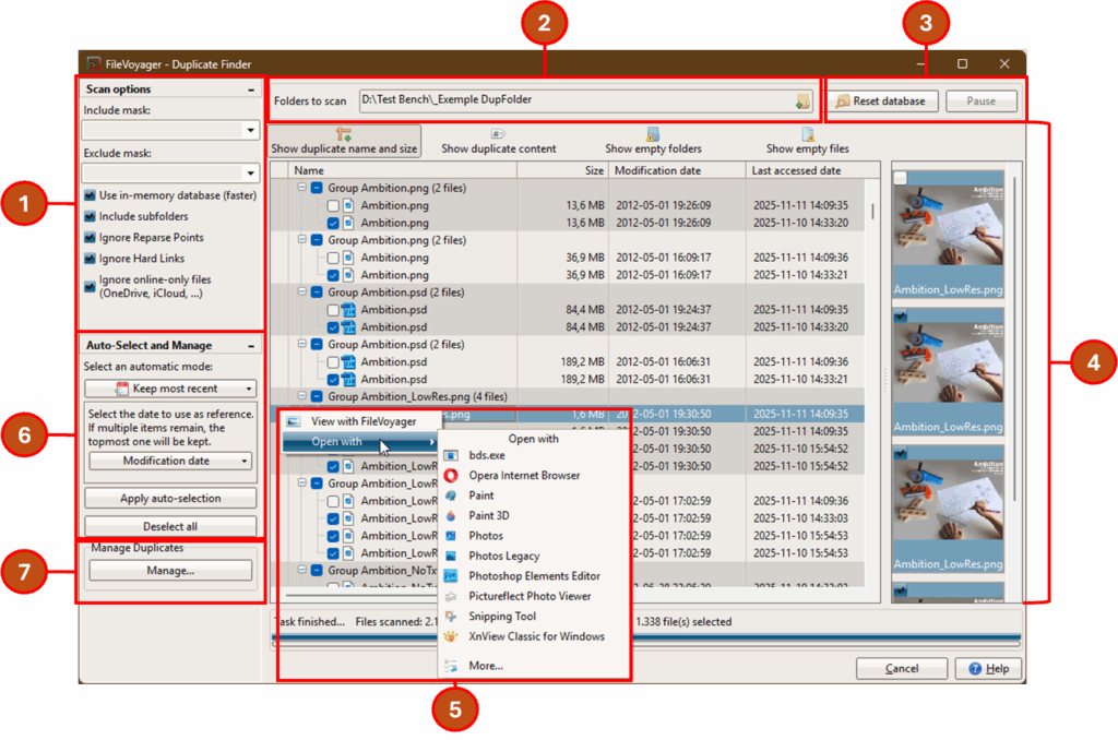 - Thumbnail preview: Visualize the contents of a duplicate group.