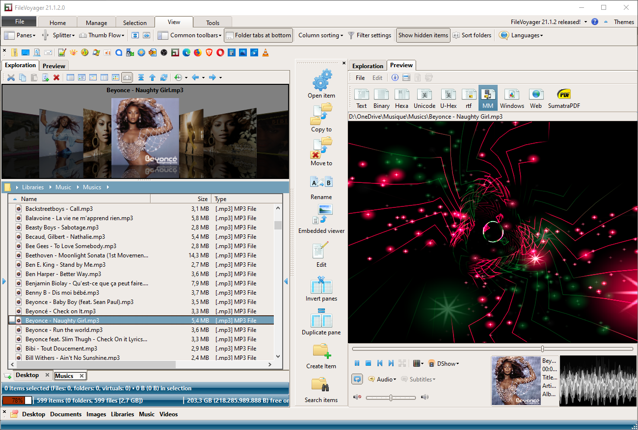 Montage of the main interface in Dark and Alien themeMain interface showing music albums in the thumbflow viewMain interface showing the viewer embedded playing music with visualization and cover thumbThe viewer in standalone mode playing music with system’s codecs and showing XMPlay visualization and cover thumbThe viewer in standalone mode showing a playlist, playing music with embedded VLC, showing VLC’s visualization The viewer in standalone playing a HD Video with embedded WMP (Windows Media Player)The viewer in standalone mode showing a file in hexadecimal modeThe viewer in standalone mode showing a Pascal source code with syntax highlightingThe viewer in standalone mode showing a PDF (powered by SumatraPDF)The Folder Sync toolThe File Comparison (Diff) toolThe Address Bar is a Crumb Bar that can be deployed on multiple levels, without a single clickExploration panel has a folder tree. By default hidden.Exploration panel has a disk list. By default hidden. Exploration panel has a folder tab bar.Built-in 7-zip allows a wide choice for Archive creation (compression and decompression)The search tools are embedded in the panels and allow multiple search parametersMultiple FileVoyager instances showing a subset of the many themes/skinsSupported archives can be browsed like any other folder, seamlesslyDialog box that allow full customization of the pinned items in the Application BarThe Application Bar allows items to be pinned for quick retrieval. Pins can handle file/folder drops on them and are fully configurable Copy items’ name or path or parent folder to the clipboardCompute folder sizes with one button click